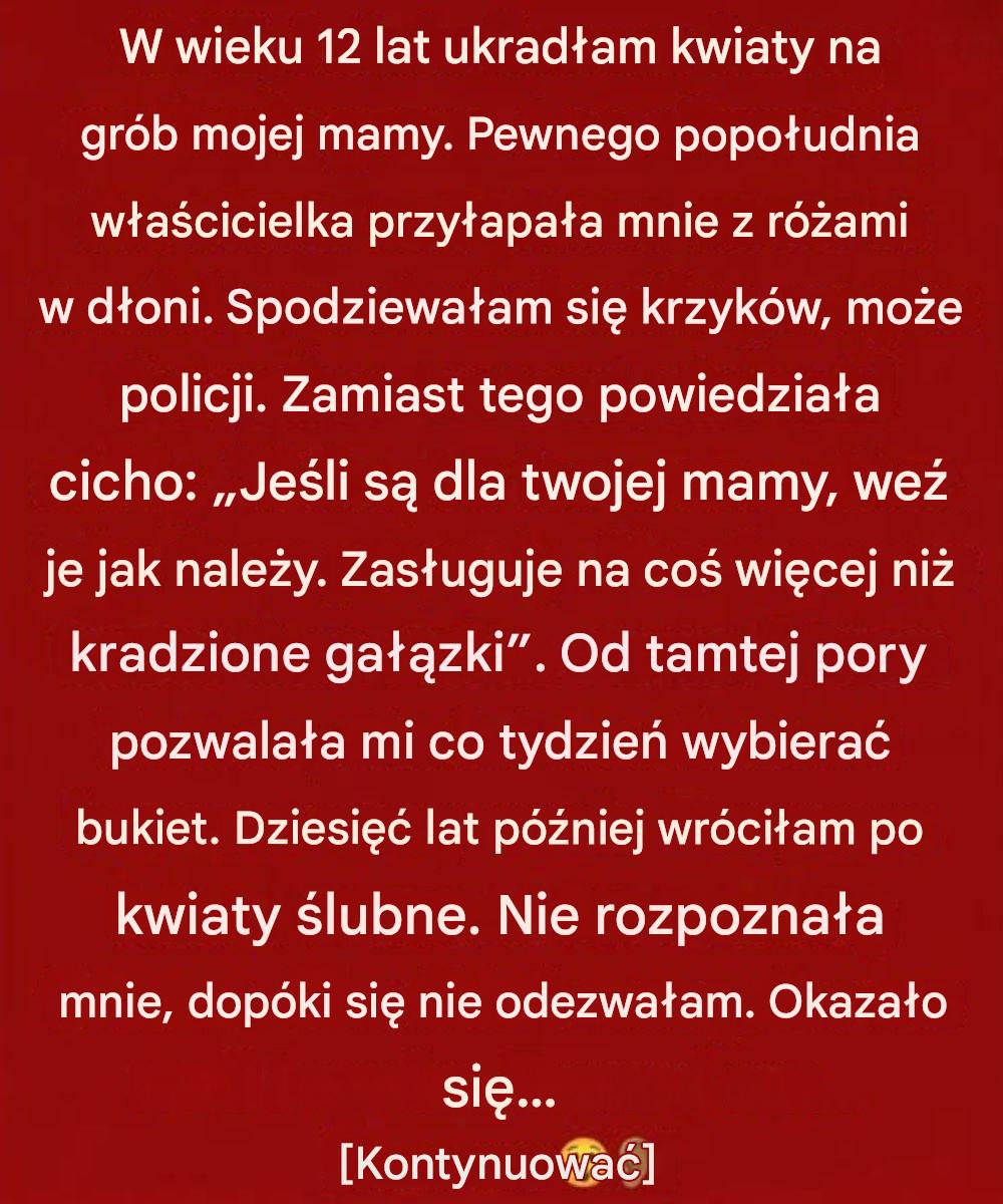 Zmarła rok wcześniej, a mój ojciec pracował po godzinach, zbyt zmęczony, by zauważyć, jak często się wymykam. Nie miałem pieniędzy. Ale przynoszenie jej kwiatów sprawiało, że czułem się blisko niej – jakby coś pięknego wciąż mogło nas połączyć.