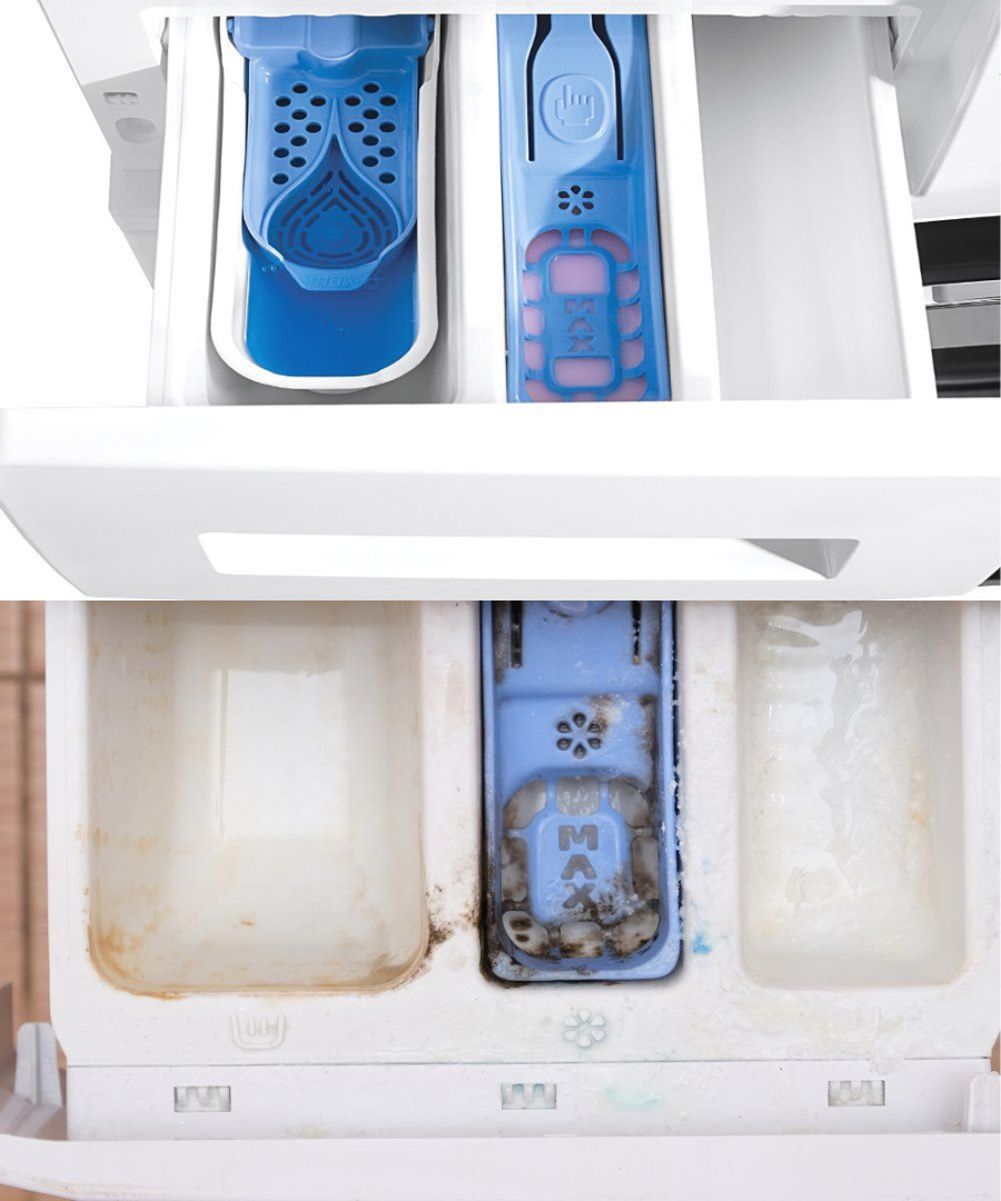 Wsyp sodę oczyszczoną do szufladki na detergent. Dodaj trochę wody i włącz