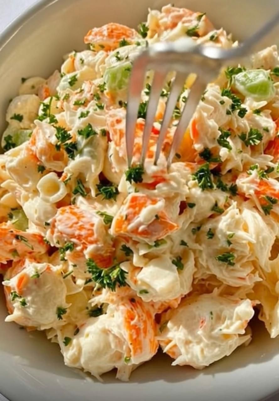 Ta szybka i łatwa sałatka z owoców morza łączy w sobie poszarpane surimi z kremowym winegretem, chrupiące warzywa oraz odrobinę świeżej cytryny i koperku dla dodatkowego smaku.