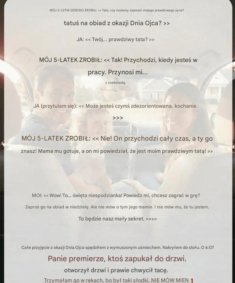 Nie okazywałem paniki. Nie pozwoliłem, by gniew wziął górę. Zamieniłem to w grę-niespodziankę na obiad z okazji Dnia Ojca, która pozwoliła jej swobodnie rozmawiać, a mnie dała chwilę spokoju na zebranie wskazówek. Była podekscytowana tym pomysłem i z radością przekuła swoje myśli w misję. Jednocześnie poczułem zimny, przytłaczający ucisk w piersi – instynkt, że coś wydarzyło się na moich oczach.