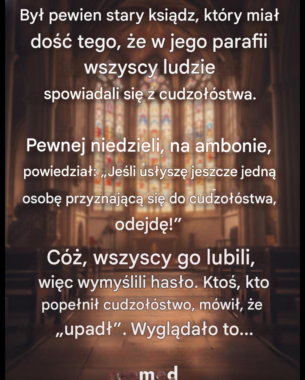 Wierni go polubili, więc wymyślili dyskretne hasło. Każdy, kto dopuścił się cudzołóstwa, mówił po prostu, że „upadł”. To rozwiązanie zdawało się zadowalać starego księdza i przez jakiś czas wszystko szło gładko – aż do jego śmierci w sędziwym wieku.