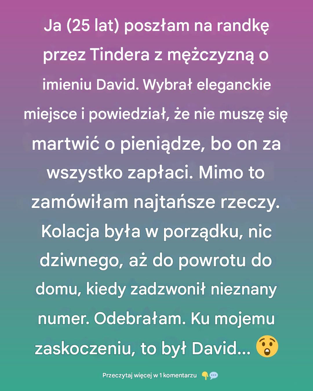 Mam 25 lat i aplikacje randkowe nauczyły mnie jednego: oczekiwania rzadko pokrywają się z rzeczywistością. Mimo to, kiedy dopasowałam się do Davida, wydawał się… w porządku. Na jego profilu widniał napis, że ma 30 lat. Brzmiał pewnie, elokwentnie i sugerował elegancką restaurację – taką, z materiałowymi serwetkami i cenami, które czujesz w piersi.