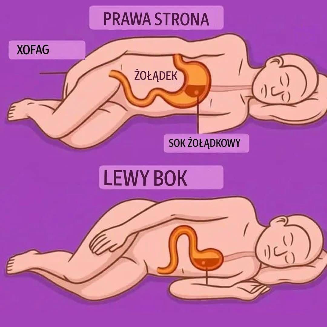 Kiedy leżysz na prawym boku, naturalne ułożenie narządów odgrywa rolę. Żołądek i przełyk nie są ułożone w ten sam sposób, jak podczas spania na lewym boku.