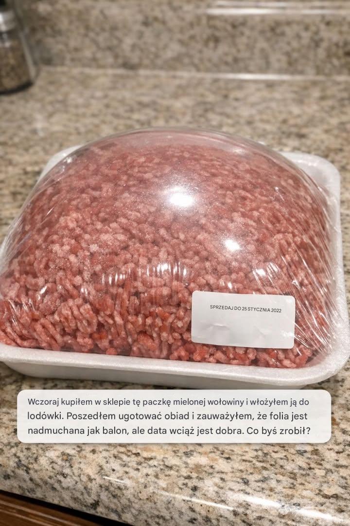 Wczoraj kupiłem w sklepie tę paczkę mielonej wołowiny i włożyłem ją do lodówki. Poszedłem ugotować obiad i zauważyłem, że folia jest nadmuchana jak balon, ale data wciąż jest dobra. Co?